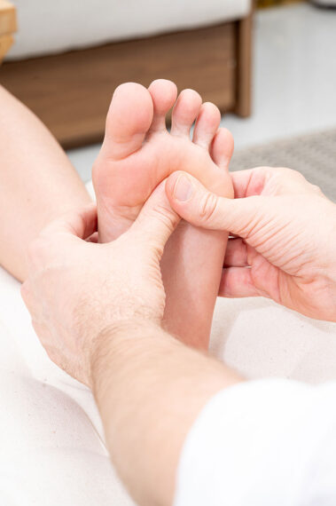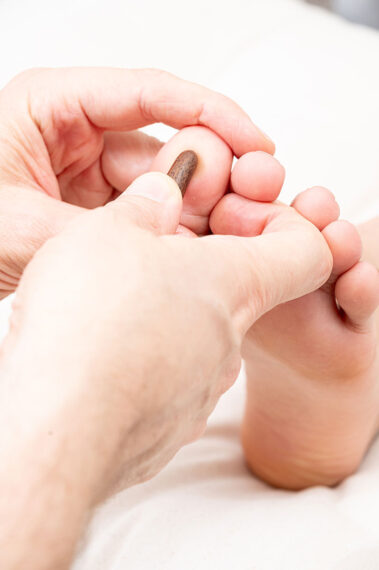 - Masażu stóp z wykorzystaniem dłoni oraz patyczka do masażu.